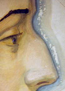 | Portrait of Anna Ahmatova by Chernoff. ( Tempera on Wood before restoration, fragments show pait loss ) | |||||||||||||||||