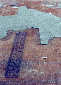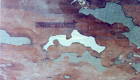 the tattered murals were spread out on a large table at the conservator's